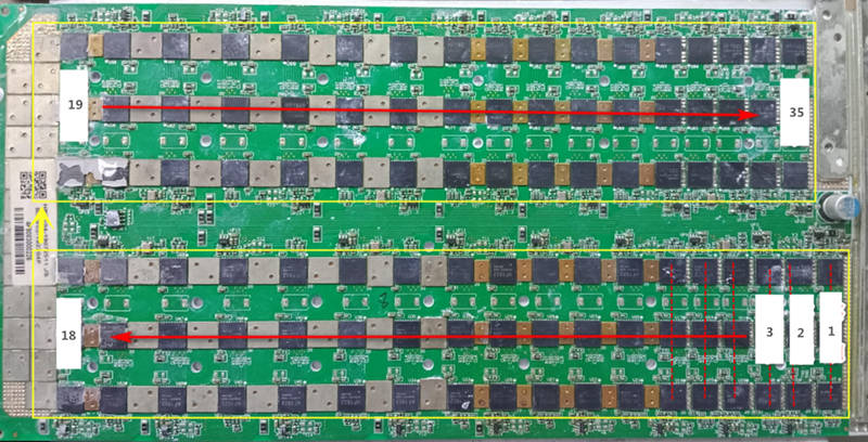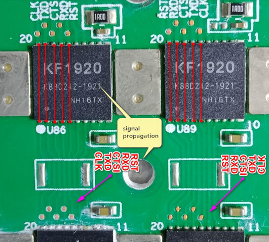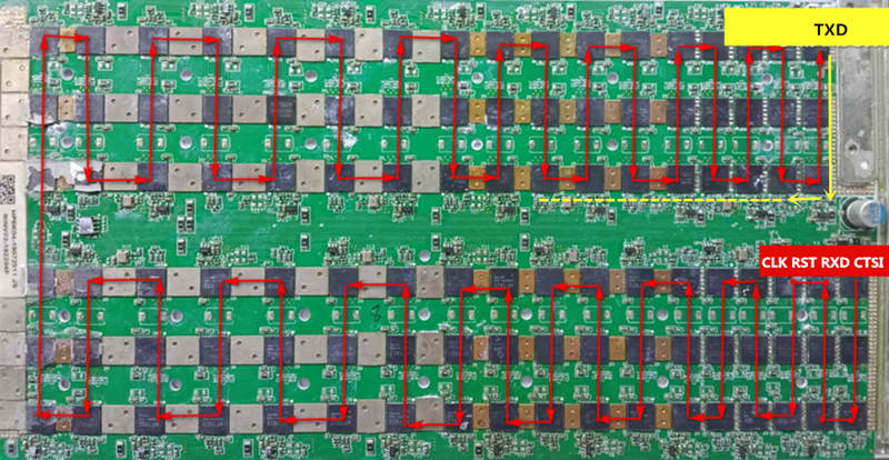 Whatsminer M20S تک هش برد از مجموع 105 چیپ مدل "KF1920" استفاده می کند ،و جهت سیگنال به ترتیب از U1 به U105 منتقل می شود.