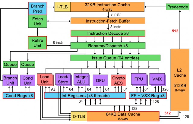 اما آیا Power8 از پردازنده Xeon اینتل قویتر هستند؟ ظاهرا این پردازندهها به مراتب سریعتر از Xeonها عمل میکنند. Power8 دارای ۱۲ هسته است که هر کدام ۵۱۲ کیلوبایت حافظه کش L2 SRAM و ۸ مگابایت حافظه سطح سوم کش L3 EDRAM بهره میبرند که با یک حافظه کلی ۶ مگابایتی سطح دوم کش و ۹۶ مگابایت حافظه سطح سوم کش کامل میشوند. این پردازنده از حافظه رم تا سقف ۱ ترابایت و با حداکثر سرعت 230GB/s (گیگابایت در ثانیه) پشتیبانی میکند و این اعداد و ارقام حتی در دنیای سرورها نیز خارقالعاده به نظر میرسند.