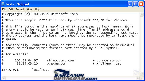 فایل چیزی شبیه شکل 3 خواهد بود. در انتهای فایل (در این مثال در زیر کلمه Localhost در متن)، IP و Domain ی را که قصد تنظیم کردن دارید وارد کنید. زمانی که مرورگر شما می خواهد به دامنه ای خاص دسترسی پیدا کند ابتدا به این فایل مراجعه می کند. اگر Domain در اینجا یافته شود، آدرس IP تعیین شده مورد استفاده قرار می گیرد. ولی اگر Domain اینجا یافت نشود DNS Server طبق روال عادی مورد استفاده قرار خواهد گرفت (به همان نحوی که در بالا ذکر شد).