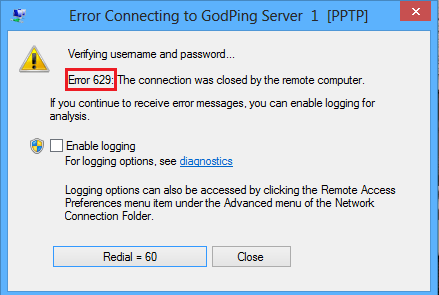 شماره ارور چیست ؟ به تصویر زیر دقت کنید . همانطور که عبارت Error 629 با کادر قرمز مشخص شده است، عدد 629 در این حالت شماره ارور می باشد .شماره ارور ها بسته به نوع isp و سیستم عامل و … متفاوت هستند . برای حل ارور های رایج در استفاده از سرویس ما، ابتدا شماره ارور را به یاد بسپارید و به دنبال راه حل آن در ادامه این آموزش باشید .