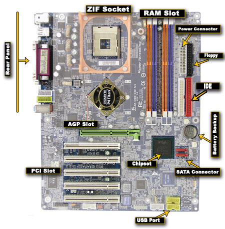 به شکل زیر توجه کنید تمامی قطعات یک مادربرد بصورت کامل توضیح داده شده است: