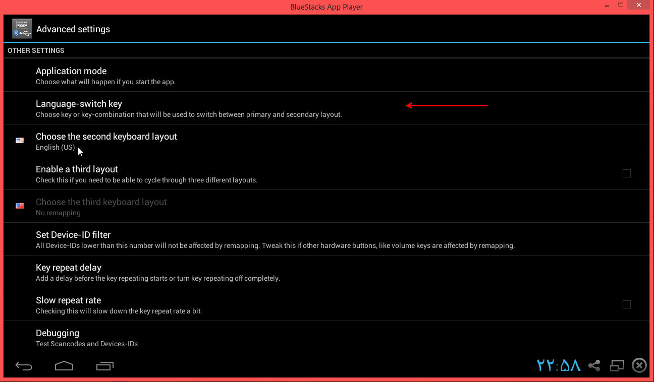 5- به advanced settings بروید و یک میانبر برای تغییر کیبورد تعریف کنید، در ضمن زبان دوم کیبورد را هم مشخص کنید.