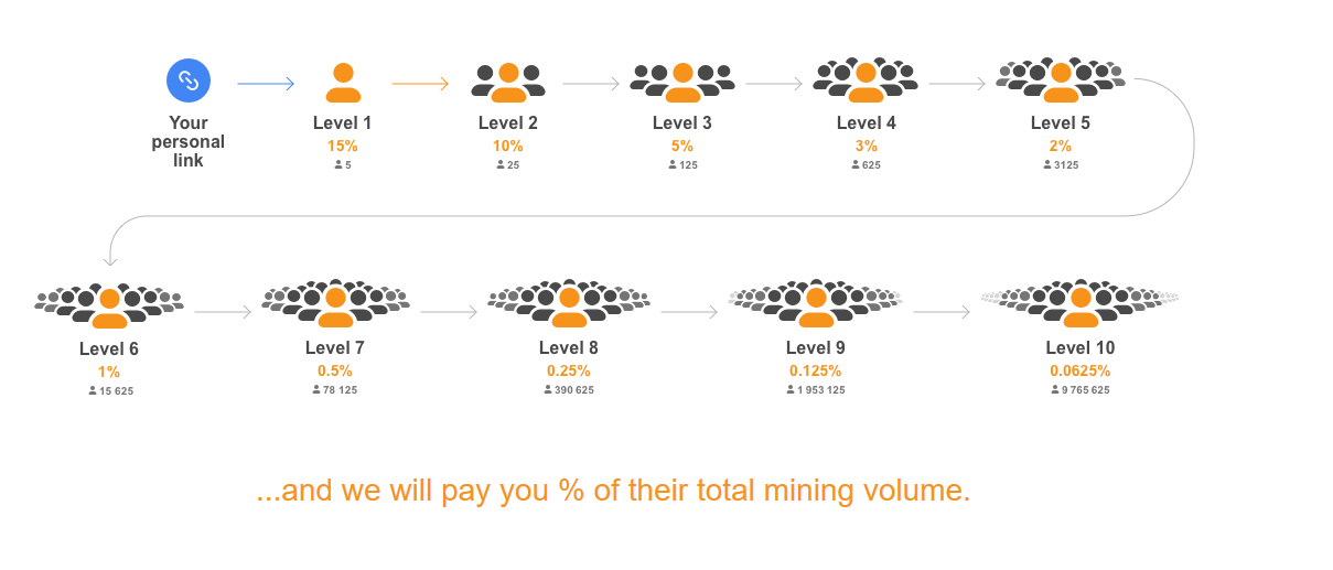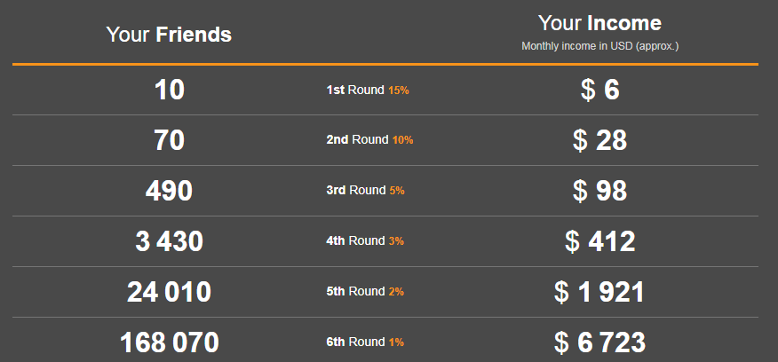 تنها با 70 نفر زیرمجموعه فعال می توانید درآمد در حدود ماهی 28 دلار ( حدود ماهی 475000 تومان) و اگر این روند تا سطح ششم ادامه داشته باشد می توانید ماهی یک بیت کوین (معادل ماهی 115 میلیون تومان) درآمد داشته باشید و حتی اگر این مجموعه تا سطح دهم پیشرفت کند درآمدی باورنکردنی و بسیار زیاد ماهی 1 میلیون دلار را به ارمغان بیاورید.