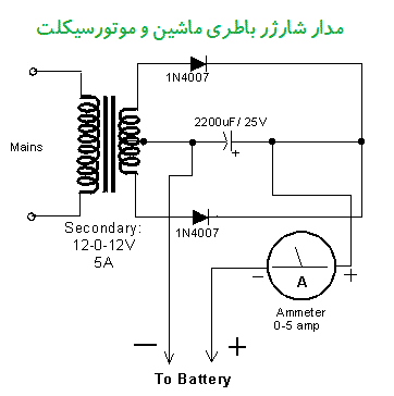 امروز برای دوستان گرامی مدار یک شارژر خوب برای باطری ماشین و موتور سیکلت را آماده کرده ایم ، این مدار به وسیله یک ترانسفورماتور 12 ولتی 5 آمپر تغذیه می شود و براحتی باطری های اسیدی را شارژ می کند . ترانس مورد استفاده باید دارای سه سر خروجی باشد ، از جمله دیگر قطعات مورد استفاده در این مدار می توان به دو عدد دیود یکسوساز 4007 ساده و یک عدد خازن شیمیایی 2200 میکروفاراد 25 ولتی و یک آمپرمتر اشاره کرد .