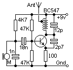 . • بر روی مدار یک ترانزیستور به شماره BC547 وجود دارد، اما می توانید از سری BF برای نتیجه بهتر نیز استفاده شود. . • برای آنتن می تونید از ۵ سانتی متر سیم تک رشته استفاده کنید و یا از قطعه فروشی ها آنتن آماده برای FM تهیه کنید.